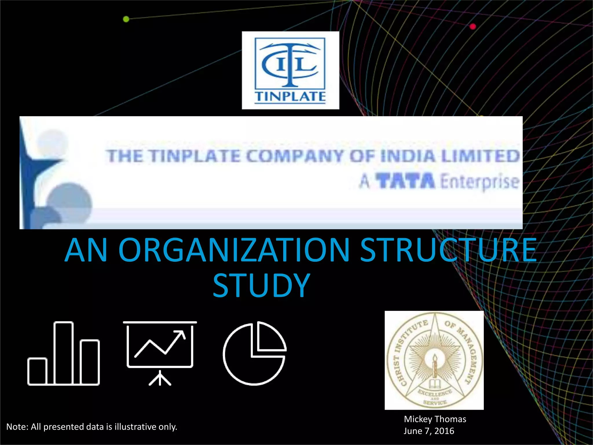 The document provides an overview of the organization structure of The Tinplate Company of India Limited (TCIL). It discusses TCIL's history, vision, products/services, leadership team, departments, policies, strengths/weaknesses, opportunities/threats, and human resource practices like training, career development, and promotion. TCIL was formed in 1920 and produces electrolytic tinplate and tin free steel used in food and beverage packaging. The organization aims to be a leader in sustainable packaging solutions and creating value for stakeholders.