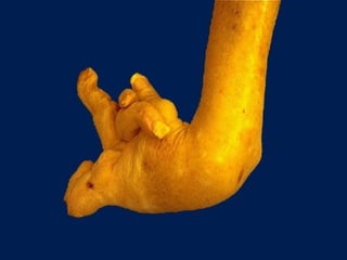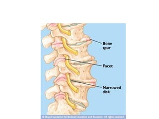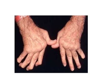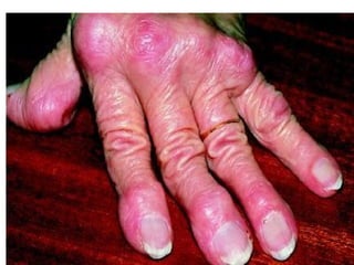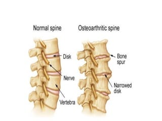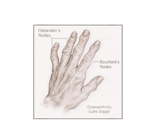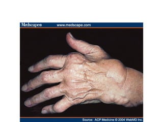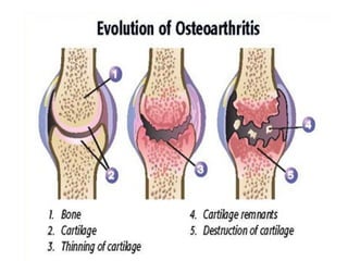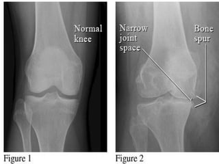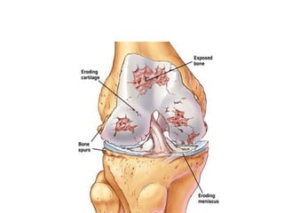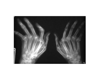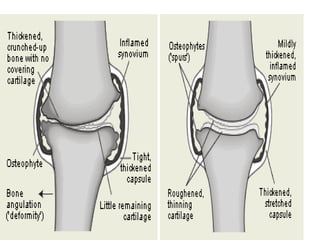 This document summarizes diseases of joints, including normal joint structure and function. It describes osteoarthritis and rheumatoid arthritis in detail. Osteoarthritis is characterized by erosion of articular cartilage in weight-bearing joints. Risk factors include age, mechanical stress, genetics, and bone density. Rheumatoid arthritis is a systemic inflammatory disease that principally attacks synovial joints, causing synovial inflammation and destruction of cartilage and bone. It is mediated by autoimmune reactions involving T cells, B cells, and cytokines like TNF and IL-1.