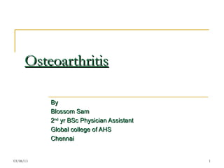 The document defines osteoarthritis as a progressive loss of cartilage in the joints due to aging, injury, or other factors. It causes pain, stiffness, and loss of movement. Symptoms worsen with activity and weather changes. Treatment focuses on reducing pain, maintaining a healthy weight, and exercising. Medications may help early on but surgery is an option for severe cases. Losing weight, exercising, and protecting joints can help prevent osteoarthritis.