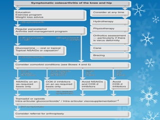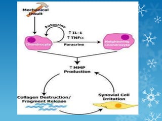 This document provides an overview of osteoarthritis. It begins by defining osteoarthritis as a type of arthritis caused by the breakdown of cartilage between bones in a joint. It then discusses the common joints affected, occurrences based on age and population, and primary versus secondary causes related to aging, injury, genetics, and other conditions. The document outlines symptoms, the etiopathogenesis of cartilage breakdown, diagnosis methods, and treatment options including non-pharmacological therapies, topical analgesics, oral medications, injections, and surgery.