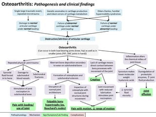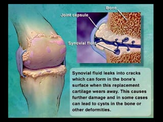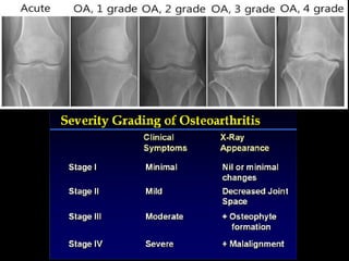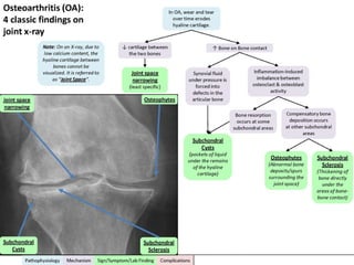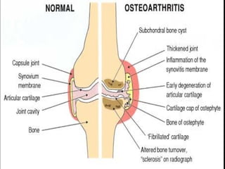Osteoarthritis (OA) is the most common form of arthritis, typically affecting older adults over age 45. It occurs when the cartilage between bones breaks down, causing pain, stiffness, and reduced mobility. Risk factors include age, female sex, joint injuries, obesity, genetics, and overuse. Symptoms include joint pain, stiffness, swelling, and crepitus. Diagnosis is made through physical exam, x-rays showing joint space narrowing and bone spurs, and ruling out other causes. Treatment focuses on reducing symptoms through medications, exercises, weight loss, bracing, and joint replacements for severe cases.