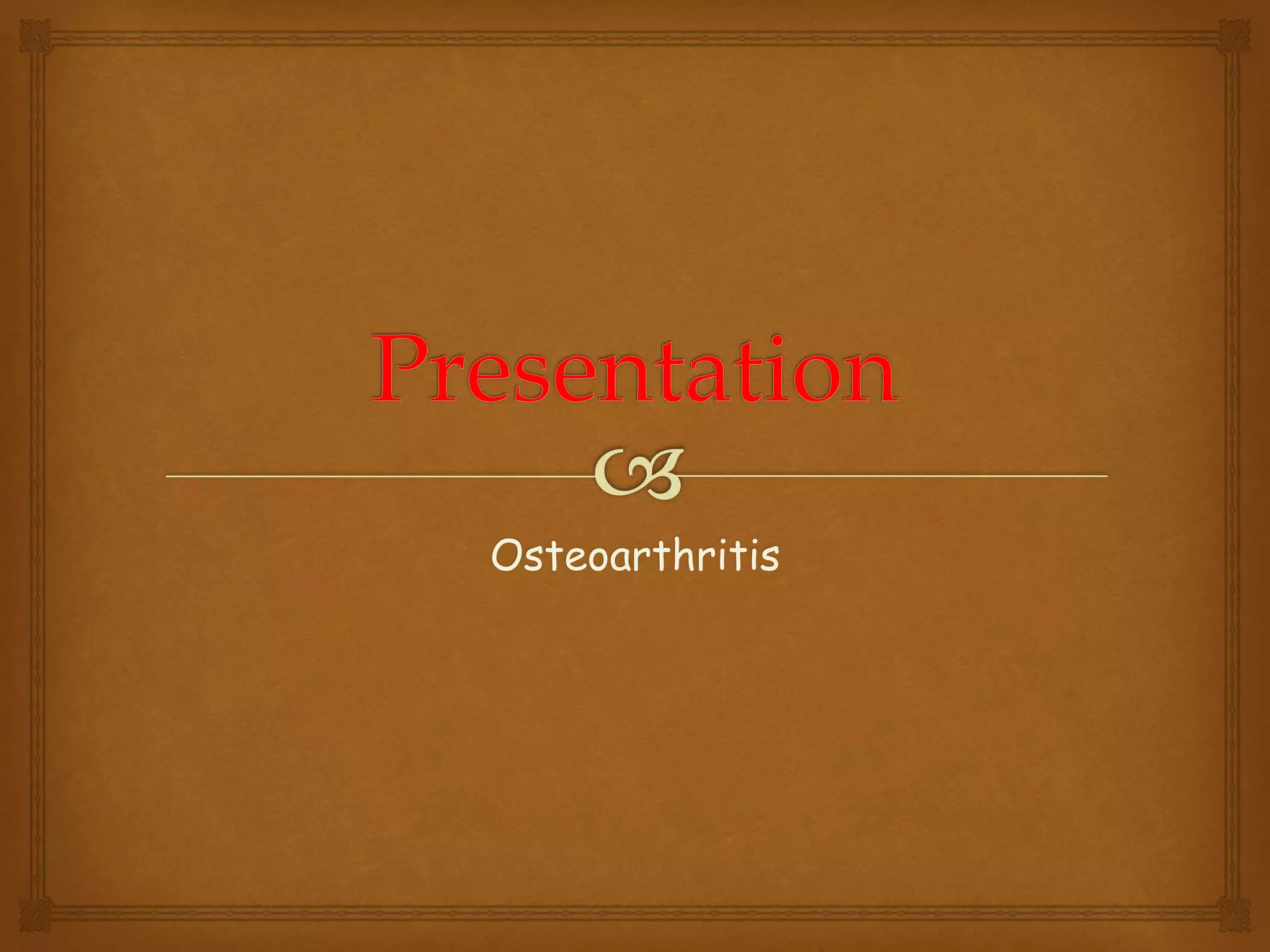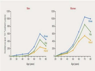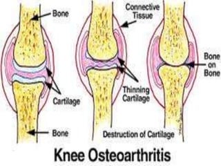 Osteoarthritis is the most common form of arthritis that involves the breakdown and eventual loss of cartilage in one or more joints. It occurs when the protective cartilage on the ends of bones wears down over time. Common symptoms include joint pain, stiffness, and limitation of movement, especially in weight-bearing joints like the hips and knees. While there is no cure for osteoarthritis, treatments can help reduce pain and maintain joint movement, including medications, physical therapy, exercise, and sometimes surgery. Osteoarthritis is diagnosed based on a patient's medical history and symptoms as well as physical examination and imaging tests.
