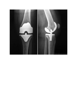 Osteoarthritis is a degenerative joint disease that commonly affects weight-bearing joints like the knee and hip. It has multiple causes but is generally attributed to normal wear and tear over time. Knee osteoarthritis symptoms include pain, swelling, stiffness, and reduced mobility. Treatments include medications, physical therapy, bracing, and knee replacement surgery for severe cases. Knee replacement surgery involves removing damaged bone and cartilage and replacing them with artificial implants. Extensive physical therapy is then needed for rehabilitation and recovery of strength and mobility.