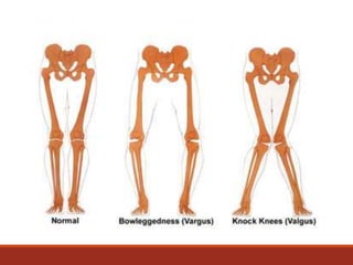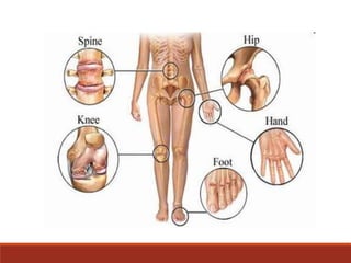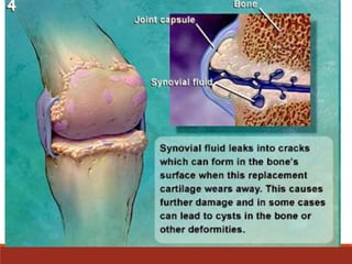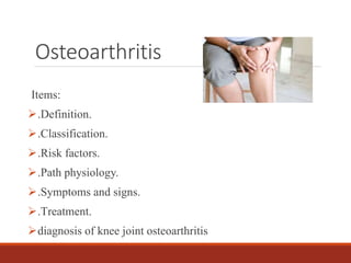 This document provides an overview of knee osteoarthritis, including its definition, classification, risk factors, pathophysiology, symptoms, treatment, and diagnosis. Osteoarthritis is defined as a progressive disorder of the joints caused by gradual loss of cartilage. It can be primary, with unknown cause related to aging, or secondary, caused by other diseases or injuries. Risk factors include age, sex, obesity, malalignment, activities, and muscle weakness. Symptoms include pain worsened by activity and at night, stiffness, swelling, deformities, instability, and loss of function. Treatment involves non-pharmacological options like exercise and weight loss, as well as pharmacological options like analgesics, NSAIDs, corticosteroids,