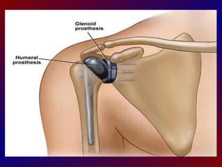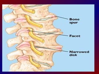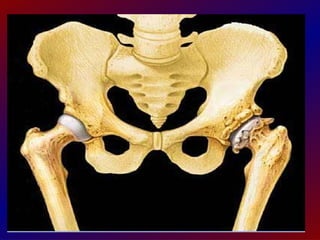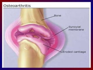 Osteoarthritis is a common form of arthritis where cartilage in joints breaks down over time. It causes pain, stiffness, and loss of mobility in joints like the hands, hips, and knees. While there is no cure, treatments can help manage symptoms and maintain activity. For mild cases, initial treatments include exercise, weight loss, heat/cold therapy, and over-the-counter pain relievers. For moderate to severe cases, stronger medications, cortisone shots, and surgery may be needed to relieve pain and disability. Joint replacement surgery can help severely affected patients resume an active lifestyle.