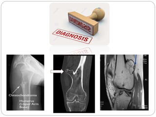 Osteochondroma is the most common bone tumor, forming cartilage-capped bony outgrowths on bones, typically during growth between ages 13-15. It occurs in the long bones of the legs, pelvis, or scapula. While most osteochondromas are asymptomatic, they can cause pain, nerve compression, or limit joint motion. Treatment involves surgery to remove symptomatic osteochondromas, while asymptomatic cases simply require follow up. Rapid growth, post-pubertal onset, or a cartilage cap over 2cm may indicate potential malignancy.