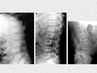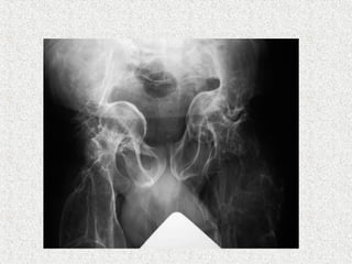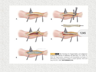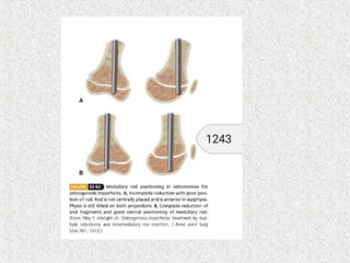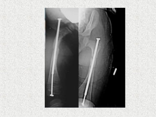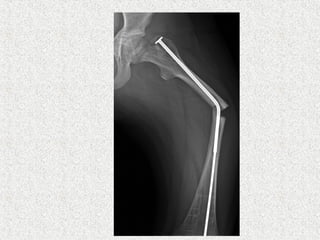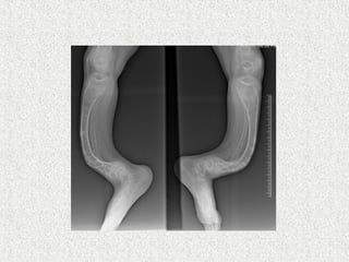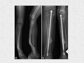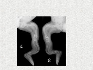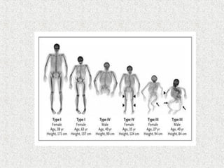 This document discusses osteogenesis imperfecta (OI), also known as brittle bone disease. It is a genetic disorder characterized by fragile bones that fracture easily, as well as other connective tissue problems. The document covers the classification, clinical features, inheritance patterns, radiographic findings, complications, and treatment options of OI, including various intramedullary rodding systems used to treat long bone deformities.