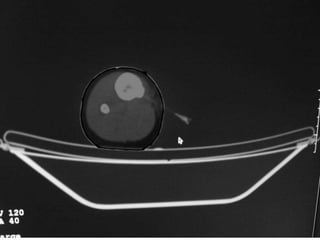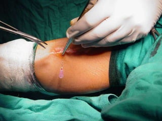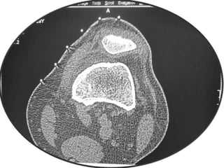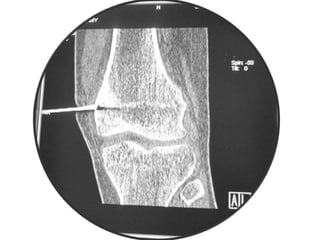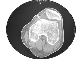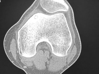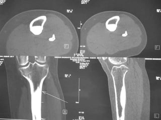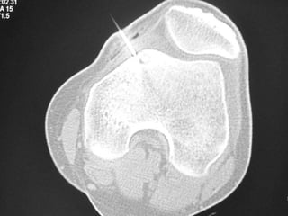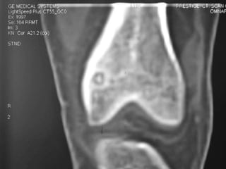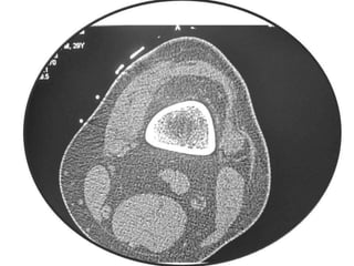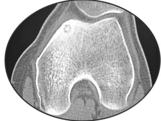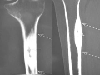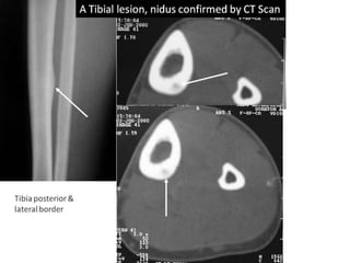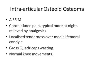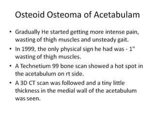 This document summarizes information about osteoid osteoma, a benign bone tumor. It describes the typical presentation as a painful lesion most common in younger males, often located in the femur or tibia. Diagnosis typically involves x-ray, CT scan or bone scan to locate the lesion. While traditionally treated with open surgical excision, minimally invasive techniques like CT-guided percutaneous excision have high success rates with less morbidity.