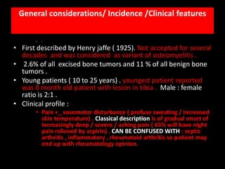 Osteoid osteoma is a benign bone tumor most common in young patients, typically causing pain worsened at night. Radiographs show a small lucent nidus surrounded by reactive sclerosis. CT precisely defines the calcified nidus. MRI demonstrates surrounding bone marrow edema. Treatment involves surgical excision or thermocoagulation of the nidus, providing effective pain relief. A multimodality imaging approach is useful to characterize the lesion and differentiate it from other causes of bone pain.