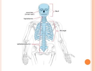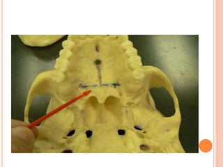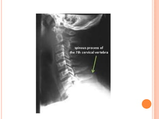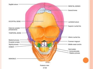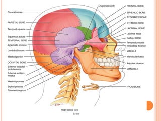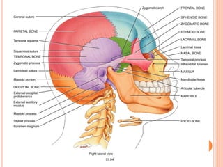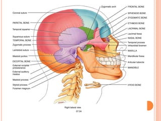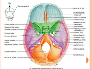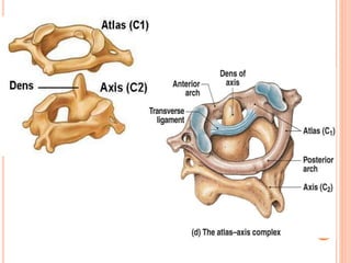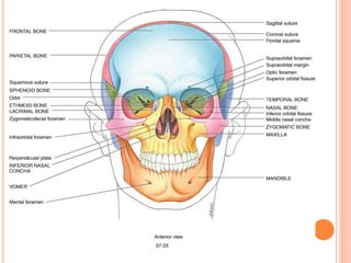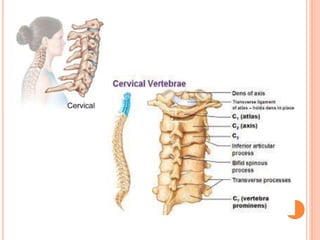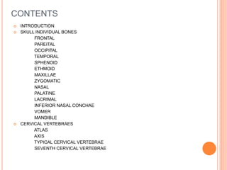 The document summarizes the bones that make up the human skull and cervical vertebrae. It describes 14 cranial bones including the frontal, parietal, occipital, temporal, sphenoid, ethmoid, maxillae, zygomatic, nasal, palatine, lacrimal, vomer and mandible. It also describes the 7 cervical vertebrae, noting the atypical features of the atlas, axis and seventh cervical vertebrae, as well as the general structure of typical cervical vertebrae.