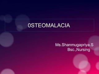 Osteomalacia, also known as adult rickets, is a metabolic bone disease characterized by inadequate mineralization caused by vitamin D deficiency, leading to softening of bones, pain, and fractures. Key factors contributing to the disease include poor diet, lack of sunlight, and various medical conditions affecting calcium and phosphate metabolism. Management involves dietary modifications, vitamin D supplementation, and potentially surgical interventions for orthopedic deformities.