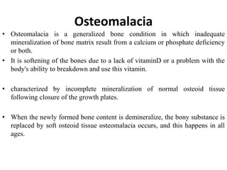 Osteomalacia is a bone condition caused by vitamin D deficiency or impaired mineralization. It results in soft, weakened bones due to incomplete mineralization of bone matrix. Symptoms include bone pain, tenderness, fractures, and muscle weakness. Diagnosis involves x-rays showing pseudofractures and bone biopsy showing excess osteoid tissue. Treatment focuses on calcium and vitamin D supplementation to promote bone mineralization. Nursing care includes education on diet, sunlight exposure, pain management, and monitoring for treatment effectiveness.