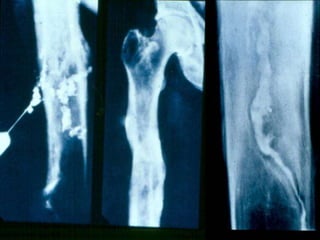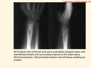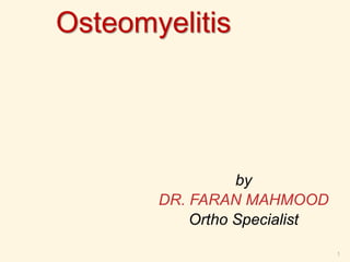 Osteomyelitis is an inflammatory process of bone caused by microbial infection. It can be acute, subacute, or chronic depending on duration. Common causes include hematogenous spread from other infections as well as direct introduction through open fractures or wounds. In acute osteomyelitis, infection starts in the metaphysis and can spread through bone canals, potentially crossing the growth plate in children. Chronic osteomyelitis results from inadequate treatment of acute infection and is characterized by persistent infection, bone necrosis, and sinus tract formation. Staging systems help classify osteomyelitis based on extent of bone and soft tissue involvement.