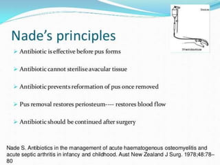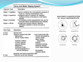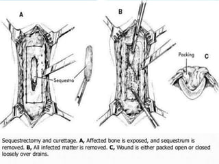 Osteomyelitis is an inflammatory condition of bone that involves the medullary cavity and has a tendency to progress along this space and involve the adjacent cortex, periosteum, and soft tissue. It is commonly caused by odontogenic infections or trauma. Staphylococcus aureus accounts for 80% of jaw osteomyelitis cases. The infection initiates from a contiguous focus or hematogenous spread and causes inflammation, tissue necrosis, pus formation, and bone destruction if not properly treated. Without treatment, it can progress to chronic stages involving bone lysis, sequestrum formation, and involucrum development.