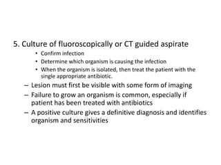 This document discusses osteomyelitis, an infection of bone tissue. It defines osteomyelitis and describes the epidemiology, sources of infection, pathogenesis, clinical features, investigations and treatment of both acute and chronic osteomyelitis. Acute osteomyelitis is usually caused by Staphylococcus aureus spreading via the bloodstream and commonly affects the long bones of children and the vertebrae, feet and pelvis of adults. Investigations include blood tests, imaging like x-rays, CT and MRI, and bone biopsy for culture and sensitivity testing. Treatment involves antibiotics, analgesia, splinting, drainage of pus if needed, and follow up to monitor for recurrence.