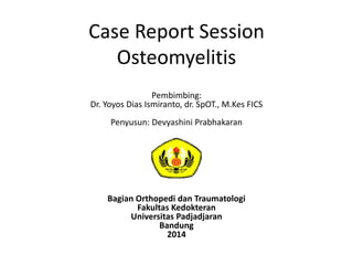 This document presents a detailed case report on chronic osteomyelitis in a 30-year-old male patient, including his medical history, physical examination results, and diagnostic imaging findings. It discusses the treatment methods, such as surgical interventions, antibiotic therapy, and management of complications, alongside the pathophysiology and clinical presentation of osteomyelitis. Additionally, it includes information on various diagnostic techniques and the classification of osteomyelitis, aiming to provide a comprehensive overview for medical professionals.
