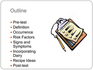 This document discusses osteoporosis, providing definitions, prevalence statistics, risk factors, signs and symptoms, prevention strategies, and recommendations for incorporating dairy. Specifically, it defines osteoporosis as a disease where bones become weak and brittle, notes that 1 in 5 women over 50 have osteoporosis and half of women over 50 will experience fractures, and recommends consuming 3 daily servings of calcium-rich dairy and doing weight-bearing exercise to help prevent osteoporosis.