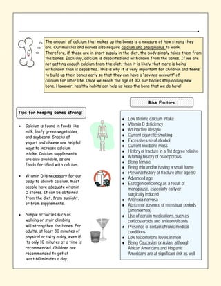 Osteoporosis is a disease characterized by porous and fragile bones. It leads to an increased risk of fractures, especially in the hip, spine, and wrist. One in five people with a hip fracture due to osteoporosis will end up in a nursing home within a year. Maintaining strong bones requires adequate calcium and vitamin D intake, weight-bearing exercise, and avoiding risk factors like smoking. A DEXA scan can diagnose osteoporosis by measuring bone mineral density and comparing to norms for young healthy individuals.