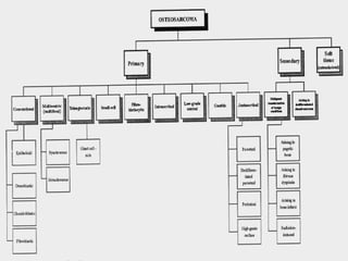 Osteosarcoma is a malignant bone tumor characterized by the production of osteoid bone. It is the second most common primary bone malignancy and occurs most often in the metaphysis of long bones in adolescents and young adults. The tumor may be conventional, presenting as osteoblastic, chondroblastic or fibroblastic subtypes, or may be a rare telangiectatic or well-differentiated variant. While the exact cause is unknown, risk factors include rapid bone growth, genetic conditions, radiation exposure and pre-existing bone diseases.