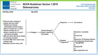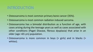 Osteosarcoma is the most common primary bone cancer, often arising in the appendicular skeleton of teenagers and young adults. It is typically a high grade tumor associated with rapid bone proliferation and spread. Treatment involves complete surgical resection with limb-sparing surgery when possible, along with chemotherapy both before and after surgery. Radiation therapy may be used for unresectable or incompletely resected tumors. Prognostic factors include tumor size, location of metastases, and response to preoperative chemotherapy. While survival has improved with modern multimodal treatment, new strategies are still needed given the risk of recurrence and lung metastases.