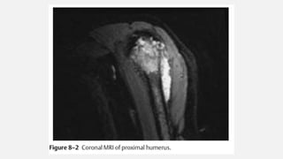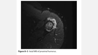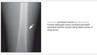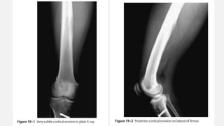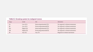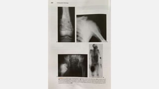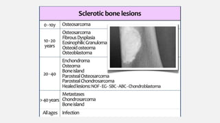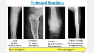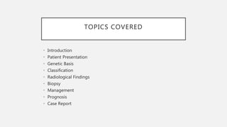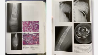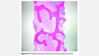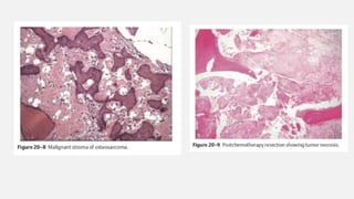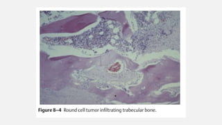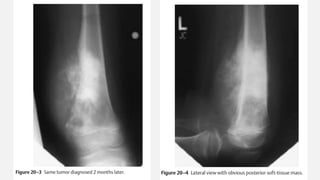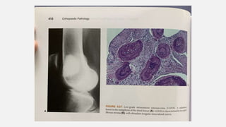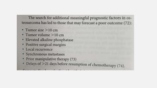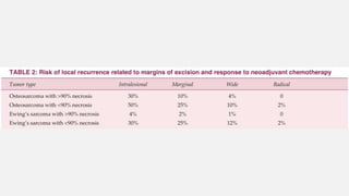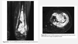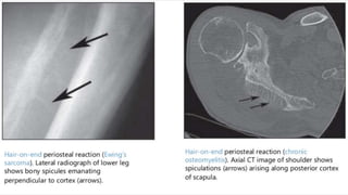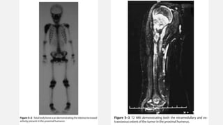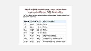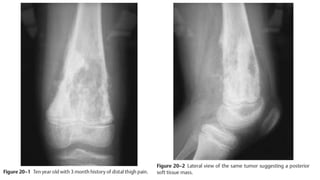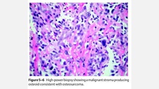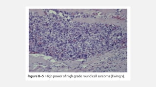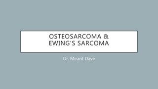 This document provides an overview of osteosarcoma and Ewing's sarcoma, including their genetic basis, clinical presentation, radiological findings, biopsy, management, and prognosis. Osteosarcoma is the second most common primary bone cancer and most commonly affects the metaphysis of long bones in adolescents and young adults. Presentation includes pain, swelling, and sometimes pathological fractures. Diagnosis involves imaging such as X-ray, CT, MRI and biopsy. Treatment typically involves neoadjuvant chemotherapy, surgical resection with wide margins, and additional chemotherapy. Prognosis depends on stage and response to treatment, with 5-year survival rates ranging from 60-80% for localized disease.