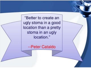 The document outlines the essentials of ostomy surgeries, specifically colostomy and ileostomy, detailing their definitions, types, and surgical techniques. It describes anatomy relevant to the procedures, including stoma configurations and principles for stoma siting. Additionally, it emphasizes techniques for creating both loop colostomy and ileostomy while considering patient visibility and anatomical factors.
