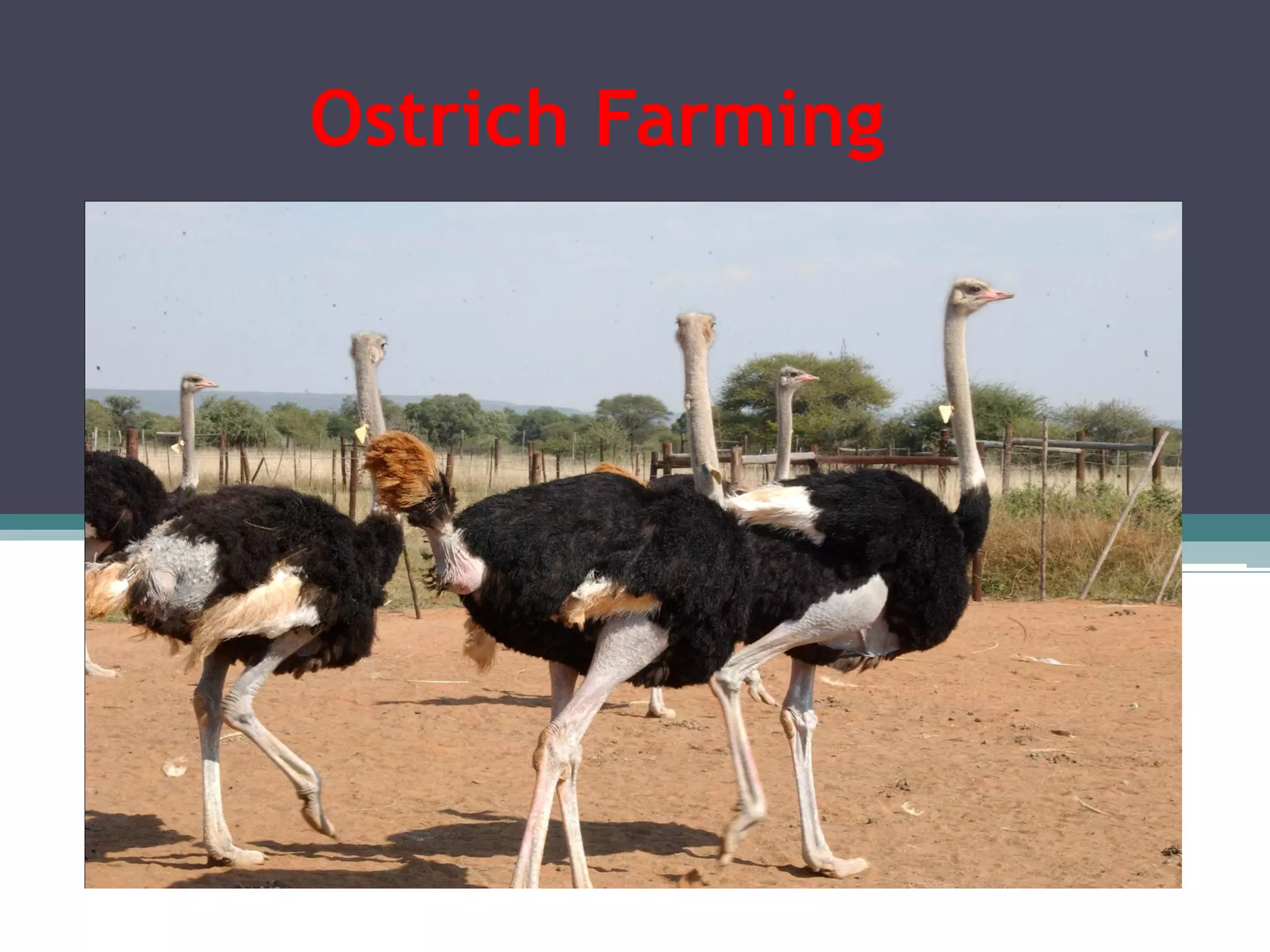 The document outlines key aspects of ostrich farming, including the birds' physical characteristics, housing requirements, and nutrition needs. It details specific care instructions for hatching, brooding, and general health management, emphasizing space, temperature, and cleanliness. Additionally, it highlights the benefits of ostrich farming such as high meat production and low cholesterol levels.