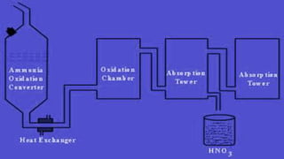 Nitric acid is produced through a multi-step industrial process involving the oxidation of ammonia. Ammonia is oxidized to nitric oxide at high temperatures in the presence of a platinum catalyst. The nitric oxide is then cooled and further oxidized to nitrogen dioxide, which is absorbed in water to form nitric acid. The dilute nitric acid is concentrated through reabsorption, resulting in a 68% concentrated solution used in fertilizer production, explosives, and other applications requiring a strong oxidizing acid.