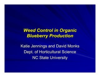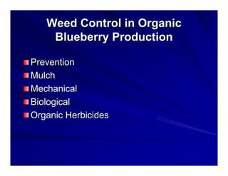 This document summarizes weed control methods for organic blueberry production, including prevention, mulching, mechanical control, biological control using geese, and organic herbicides. Prevention focuses on sanitation and using weed-free materials. Mulches like plastic, organic mulches, and living mulches are discussed. Mechanical methods include hand weeding, cultivation, mowing, and flaming. Chinese weeder geese can be used for biological control if grass is present. The document reviews several organic herbicides including horticultural vinegar, clove oil products, and bitter almond extract, providing use rates and efficacy information. Photos demonstrate the performance of different organic herbicides on various weed species.