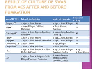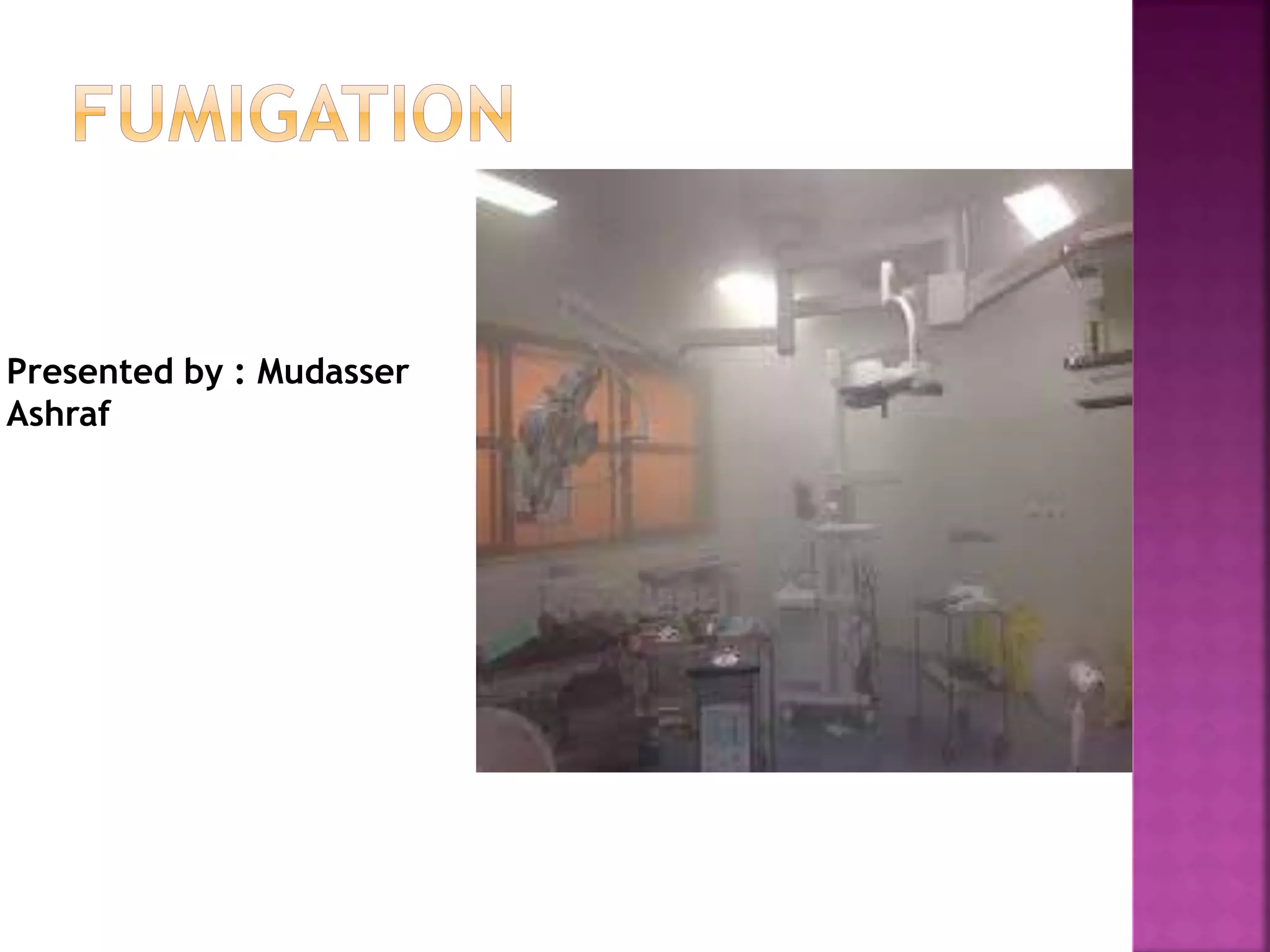 Fumigation is a process used to sterilize operating theaters and other hospital areas using formaldehyde gas. It involves cleaning the area, sealing it, and heating a formaldehyde solution to generate gaseous formaldehyde. The gas kills microbes but is toxic, so protective equipment must be worn. After 12-24 hours, ammonia is released to neutralize the formaldehyde. A record of all fumigation details must be maintained. Several other toxic gases can also be used for fumigation but require special precautions due to their strong potency. Exposure to fumigation gases usually causes immediate side effects that are treated by inducing vomiting and giving medications to reduce the chemical concentration in the body.