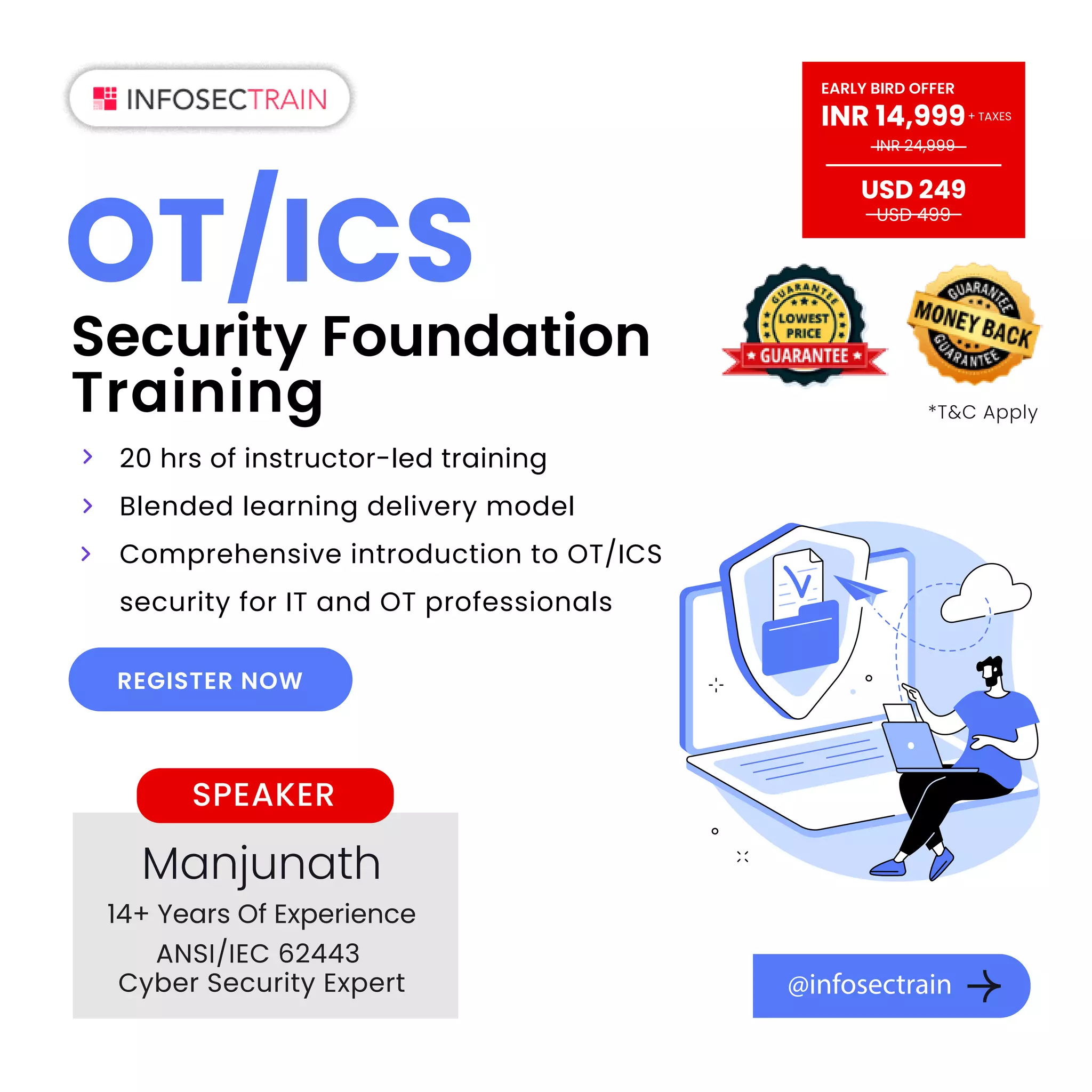 The document promotes a comprehensive 20-hour instructor-led training course on OT/ICS security, aimed at IT and OT professionals, presented by expert Manjunath with over 14 years of experience. The course covers key aspects of OT/ICS security, including architecture, threats, risk assessment, and best practices, while highlighting potential career benefits in various OT/ICS security roles. Early bird pricing is offered, along with detailed course content and learning objectives.