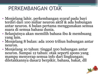 Dokumen ini menjelaskan perkembangan otak manusia dari lahir hingga usia 12 tahun, mencakup struktur dan fungsi masing-masing bagian otak, seperti cerebrum, cerebellum, brainstem, dan sistem limbik. Selain itu, dikemukakan perbedaan fungsi antara otak kiri yang analitis dan otak kanan yang kreatif, serta peran lingkungan dalam mengoptimalkan perkembangan keduanya. Tinjauan ilmiah dan pandangan Islam mengenai perkembangan intelektual manusia juga diuraikan.