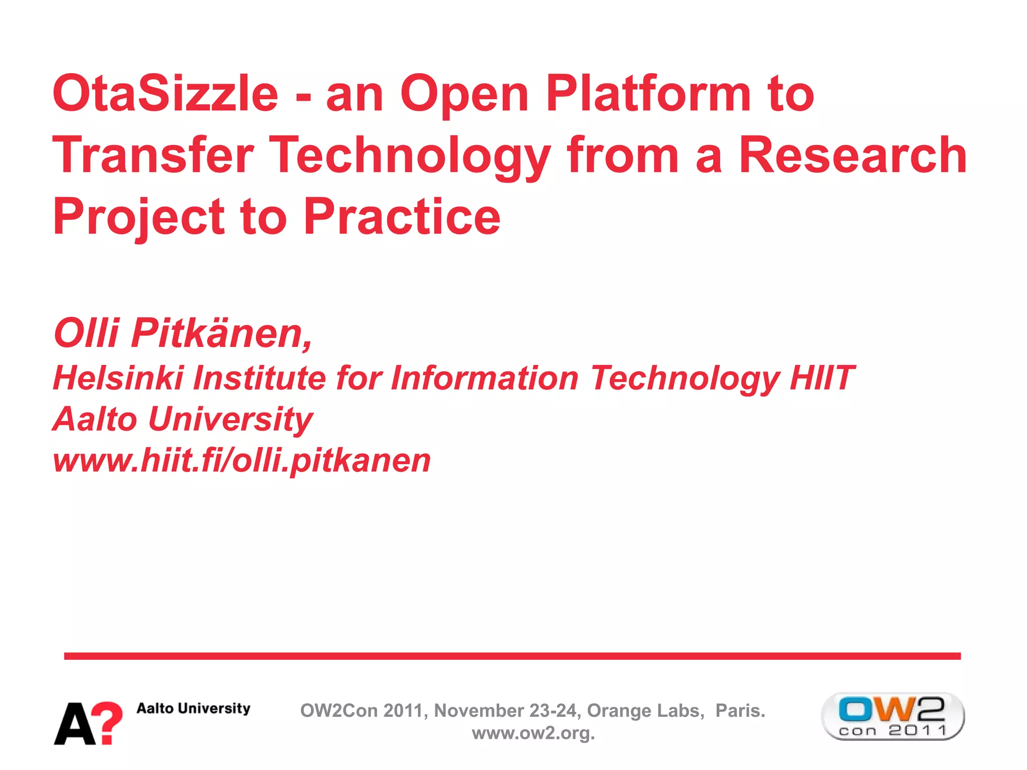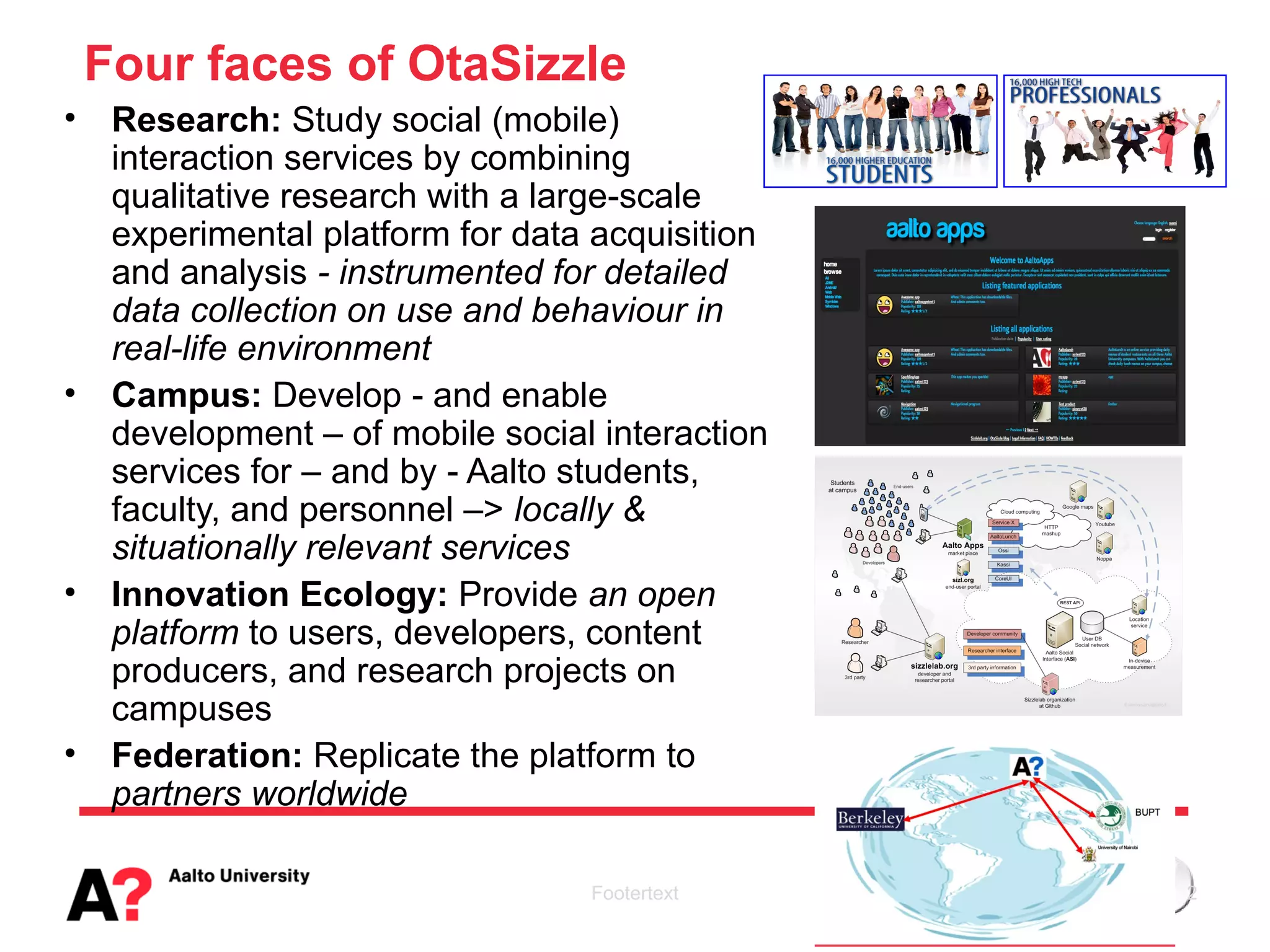 The document describes OtaSizzle, an open platform for transferring technology from research projects to practice through four main components: conducting social interaction research, developing services for university campuses, providing an open innovation platform, and replicating the platform internationally. It discusses the research themes, platform users, example services, developing an international network, and addresses intellectual property rights and data privacy considerations.