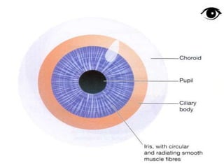 This document provides an overview of the anatomy and physiology of the eye. It describes the main layers and structures of the eye including the sclera, cornea, iris, lens, retina, and vitreous humor. It explains how light enters the eye and is focused on the retina to produce vision. Common minor eye disorders like dry eye, conjunctivitis and styes are discussed. Over-the-counter eye products for conditions like artificial tears, ointments, scrubs and decongestants are also outlined. The document concludes with a brief discussion of contact lenses and lens care.