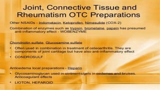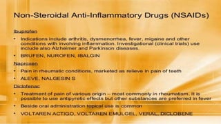 This document discusses nonprescription medications and the pharmacist's role in nonprescription drug therapy. It provides information on different types of nonprescription medications (OTC, BTC), factors driving self-medication, and the pharmacist's steps to assess patients and recommend appropriate self-treatable conditions or referrals. It also covers guidelines for treating common conditions like headaches, fever, and drug interactions to consider with nonprescription analgesics. The pharmacist's role is to properly assess patients, advise on treatment options, educate on proper use and monitoring of OTC medications, and evaluate treatment outcomes.