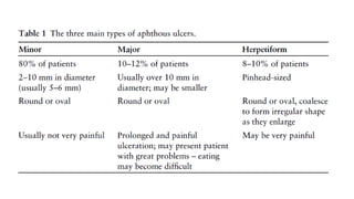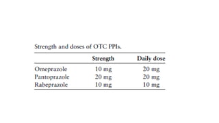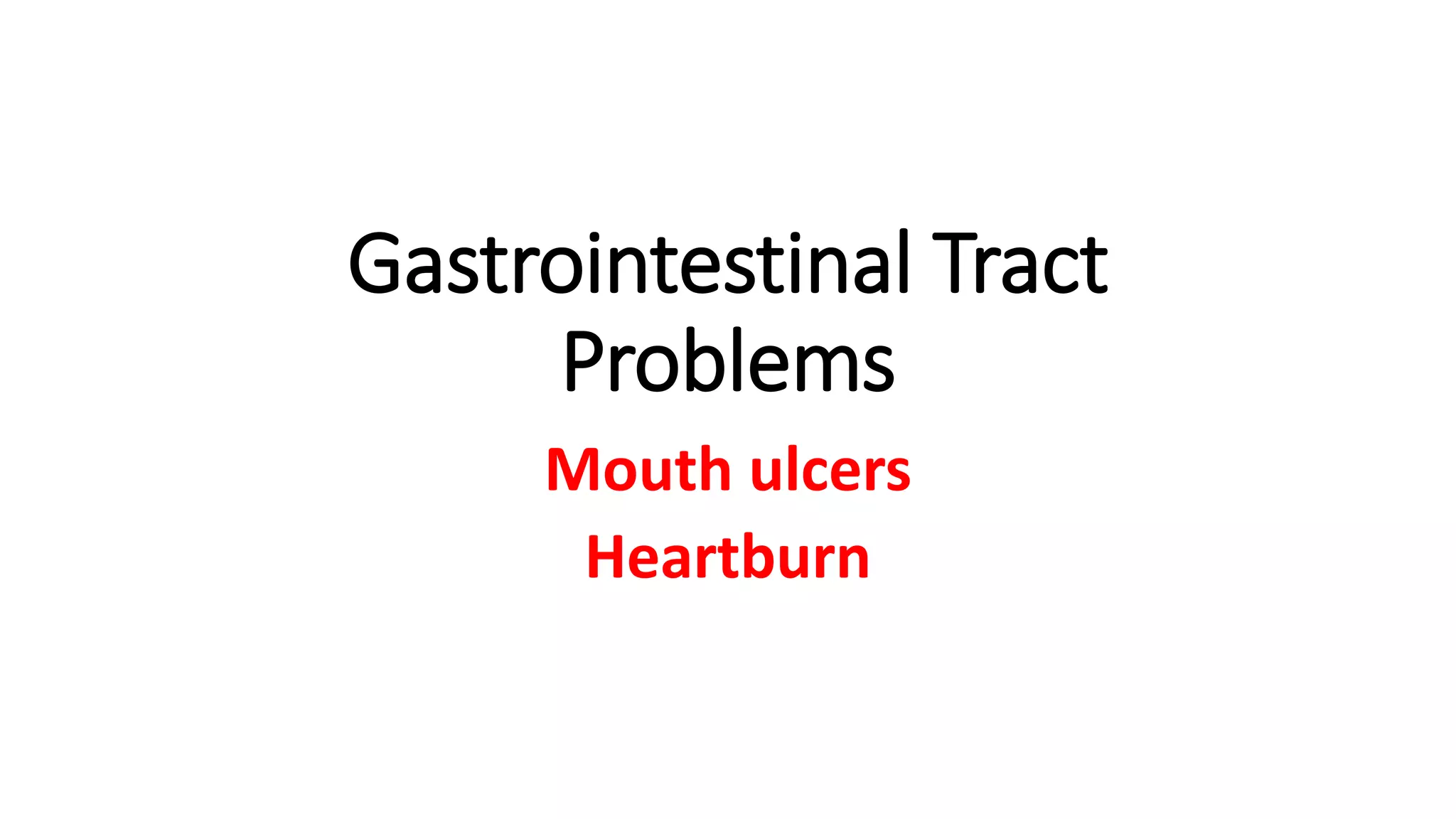 The document discusses gastrointestinal tract problems including mouth ulcers and heartburn. It provides details on types of mouth ulcers, symptoms, causes, risk factors, management, and when referral is necessary. It also discusses symptoms of heartburn such as a burning sensation in the upper stomach exacerbated by certain foods or positions. Management options for heartburn include antacids, alginates, H2 blockers, and proton pump inhibitors. Lifestyle changes like weight loss and avoiding aggravating foods or smoking can help reduce symptoms.