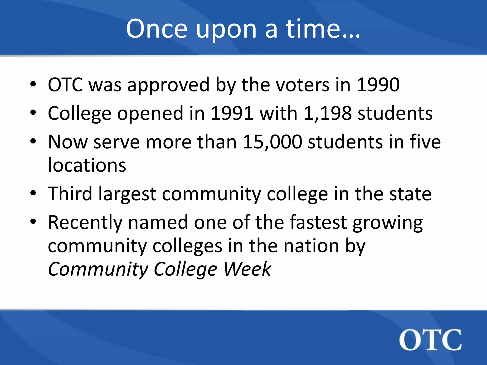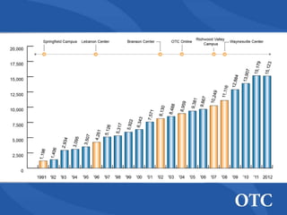OTC Foundation has grown significantly since being established in 1996, raising over $14 million for scholarships, student support programs, and workforce development centers. The document outlines OTC's strategies for successful fundraising and grant development, including maintaining a small dedicated grants team, collaborating with community partners to share their mission, building strong interpersonal relationships, and expressing sincere gratitude to donors through various recognition efforts.