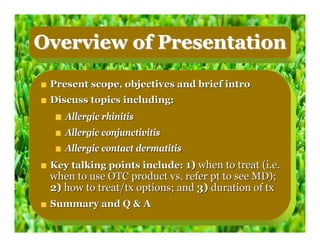 This document provides an overview of over-the-counter treatment options for allergic rhinitis, conjunctivitis, and contact dermatitis, focusing on when to self-treat versus seek medical advice. It outlines various treatment regimens, including antihistamines, decongestants, and alternative therapies, while highlighting important patient counseling points for safe and effective medication use. The presentation also discusses the prevalence of allergies in the U.S. and emphasizes the need for patient education regarding allergy management.