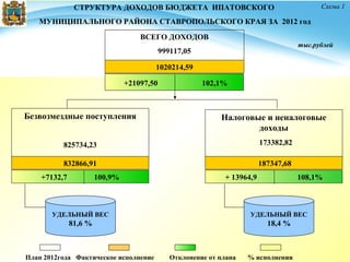 Отчет о исполнении бюджета Ипатовского муниципального района за 2012 год демонстрирует превышение фактических доходов над плановыми, с общими доходами в 1,020,214.59 тыс. рублей и более высокими налоговыми поступлениями. Расходы бюджета также соответствуют плану с кассовым исполнением 102.9%. Основными источниками доходов являются налоговые поступления и безвозмездные поступления, с незначительной задолженностью по налоговым и неналоговым доходам на начало 2013 года.