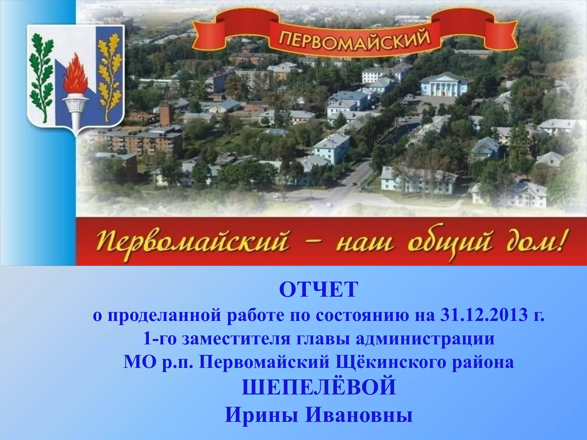 Документ представляет отчет о финансовой деятельности и выполненных работах администрации МО р.п. Первомайский за 2013 год. Основные доходы составили 95 927 тыс. рублей, с расходами на сумму 93 646 тыс. рублей, в том числе на ремонт дорог и жилищное строительство. В 2014 году предусмотрены доходы и расходы в аналогичном размере.