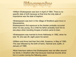 This document provides a biography of William Shakespeare and a summary of his play Othello. It outlines that Shakespeare was born in 1564 in Stratford-upon-Avon and went on to have a successful career in theater in London before retiring to Stratford. The summary then discusses the plot of Othello over five acts, where the villain Iago manipulates Othello into believing his wife Desdemona has been unfaithful with Cassio, ultimately driving Othello to murder Desdemona.