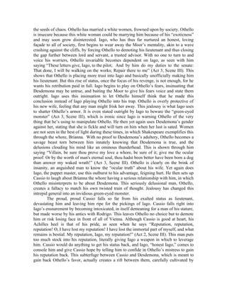 Iago manipulates several characters in Shakespeare's Othello through exploiting their weaknesses and sowing seeds of doubt. He turns Rodrigo's obsession with Desdemona to his advantage by getting money from Rodrigo. Iago plays on Othello's insecurities about his race and marriage to Desdemona to make Othello jealous. He uses Cassio's pride and desire to regain his position to further implicate Cassio in his schemes. Iago is a master manipulator who is able to gain people's trust while covertly influencing their thoughts and actions to suit his own malicious ends.