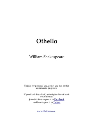 Othello This is thywork:—the object poisons sight; Let it be hid.—Gratiano, keep the house, And seize upon the fortunes of the Moor, For they succeed on you.—To you, lord governor, Remains the censure of this hellish villain; The time, the place, the torture,—O, enforce it! Myself will straight aboard; and to the state This heavy act with heavy heart relate. [Exeunt.] THE END Strictly for personal use, do not use this file for commercial purposes. If you liked this eBook, would you share it with your friends? Just click here to post it to Facebook and here to post it to Twitter www.libripass.com