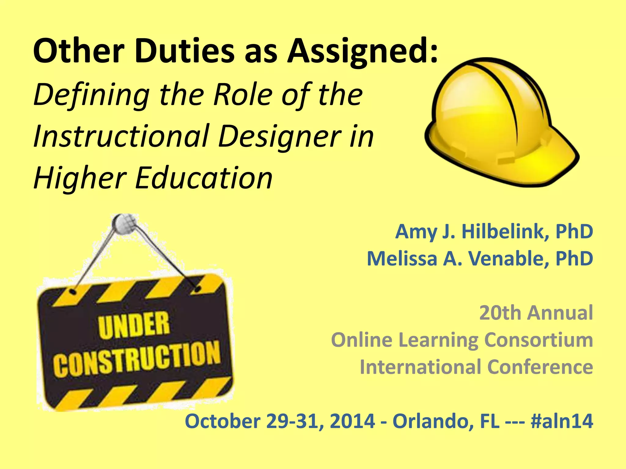 Other Duties asAssigned: Defining the Role of the Instructional Designer in Higher Education Amy J. Hilbelink, PhD Melissa A. Venable, PhD 20th Annual Online Learning Consortium International Conference October 29-31, 2014 - Orlando, FL --- #aln14