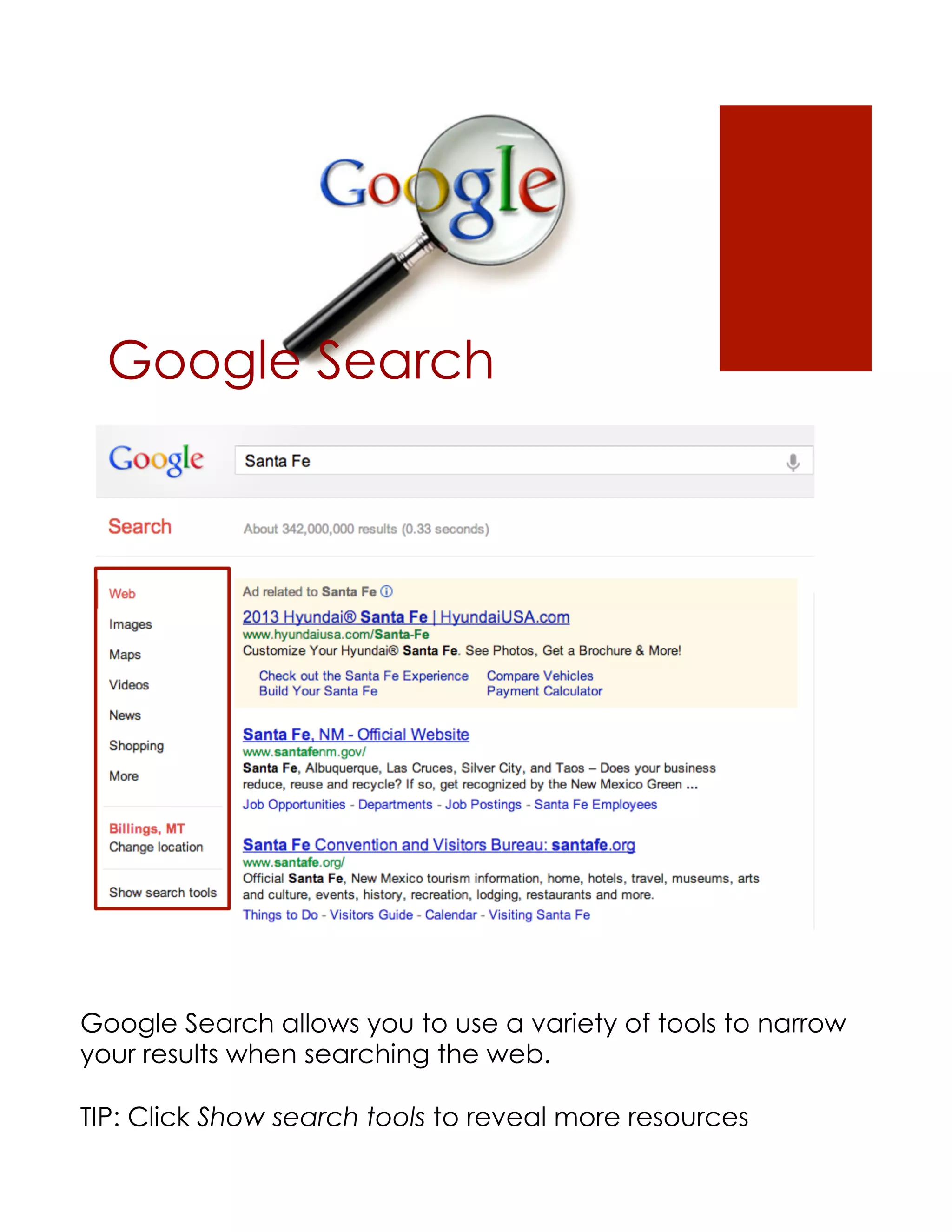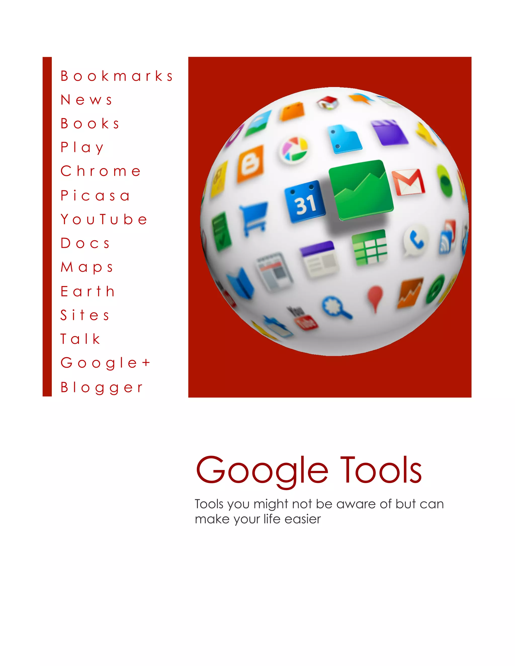 Google provides a variety of tools that can make life easier. These include Google Search, which allows narrowing search results using tools and filters; Google Bookmarks for saving and organizing bookmarks across devices; Google News for personalized news feeds; Google Books for previewing and searching the full text of millions of books; and Google Play for storing and accessing purchased media from any device with internet access. Additional tools include Google Chrome browser, Google Plus for social networking, and Google Dashboard for centralized account access and settings.