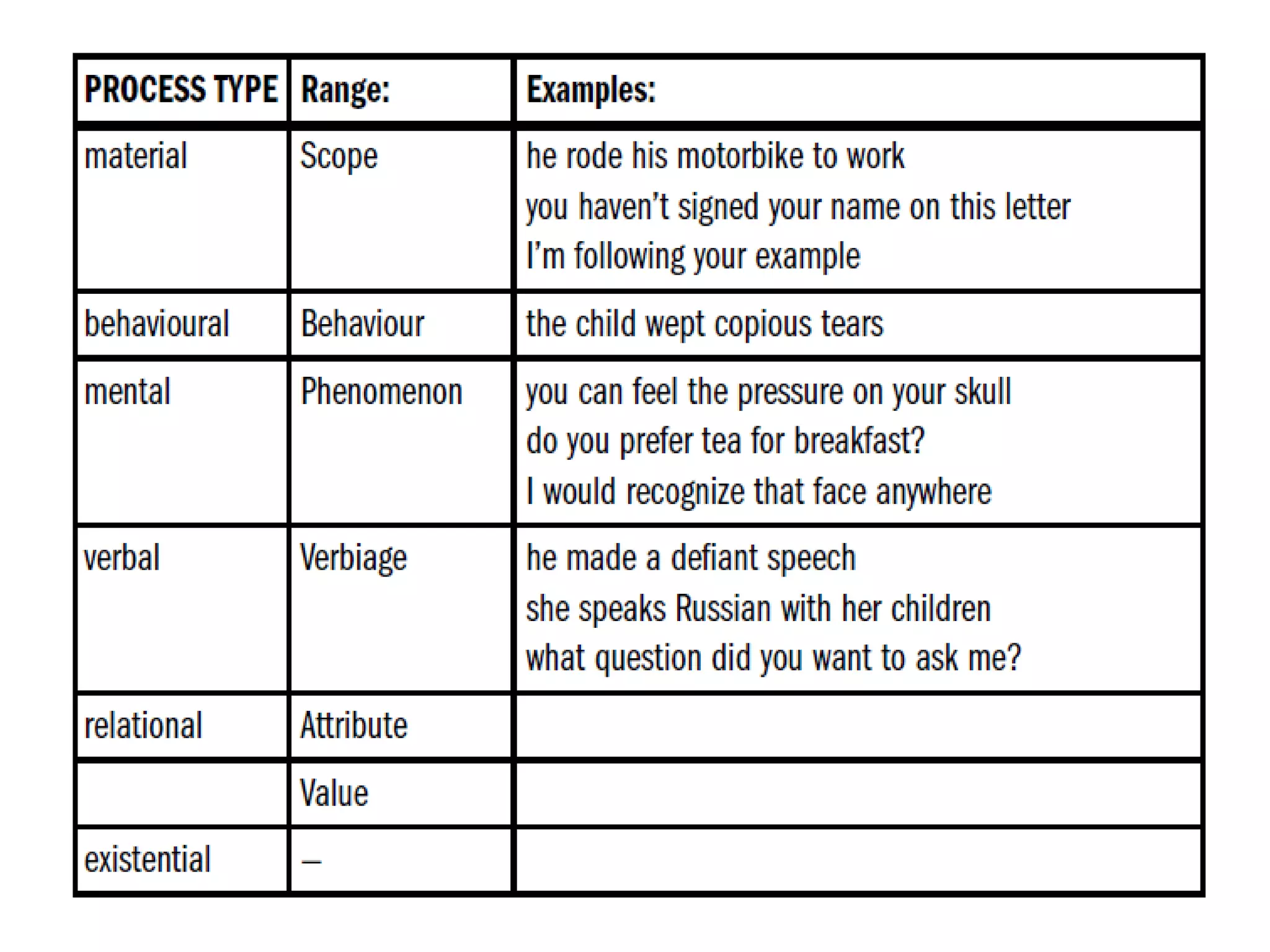 The document discusses different types of processes and participants in processes. There are three main types of processes: material, mental, and relational. There are also subsidiary process types: behavioural, verbal, and existential. The document also describes different participant functions including beneficiary, recipient, client, receiver, and range. Beneficiaries are participants that processes are done for or to. Ranges specify the scope or domain of a process.