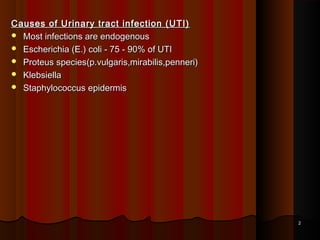 UTIs are grouped as pyelonephritis (inflammation of the renal pelvis, tubules, and interstitium) or cystitis (inflammation of the urinary bladder). The most common causes of UTIs are endogenous bacteria like E. coli, which cause 75-90% of infections. Risk factors include urinary obstruction, pregnancy, vesicoureteral reflux, diabetes, and instrumentation. Complications can include renal abscesses, pyonephrosis if the kidney is completely obstructed, and acute renal failure. Chronic pyelonephritis may cause scarred and deformed kidneys.