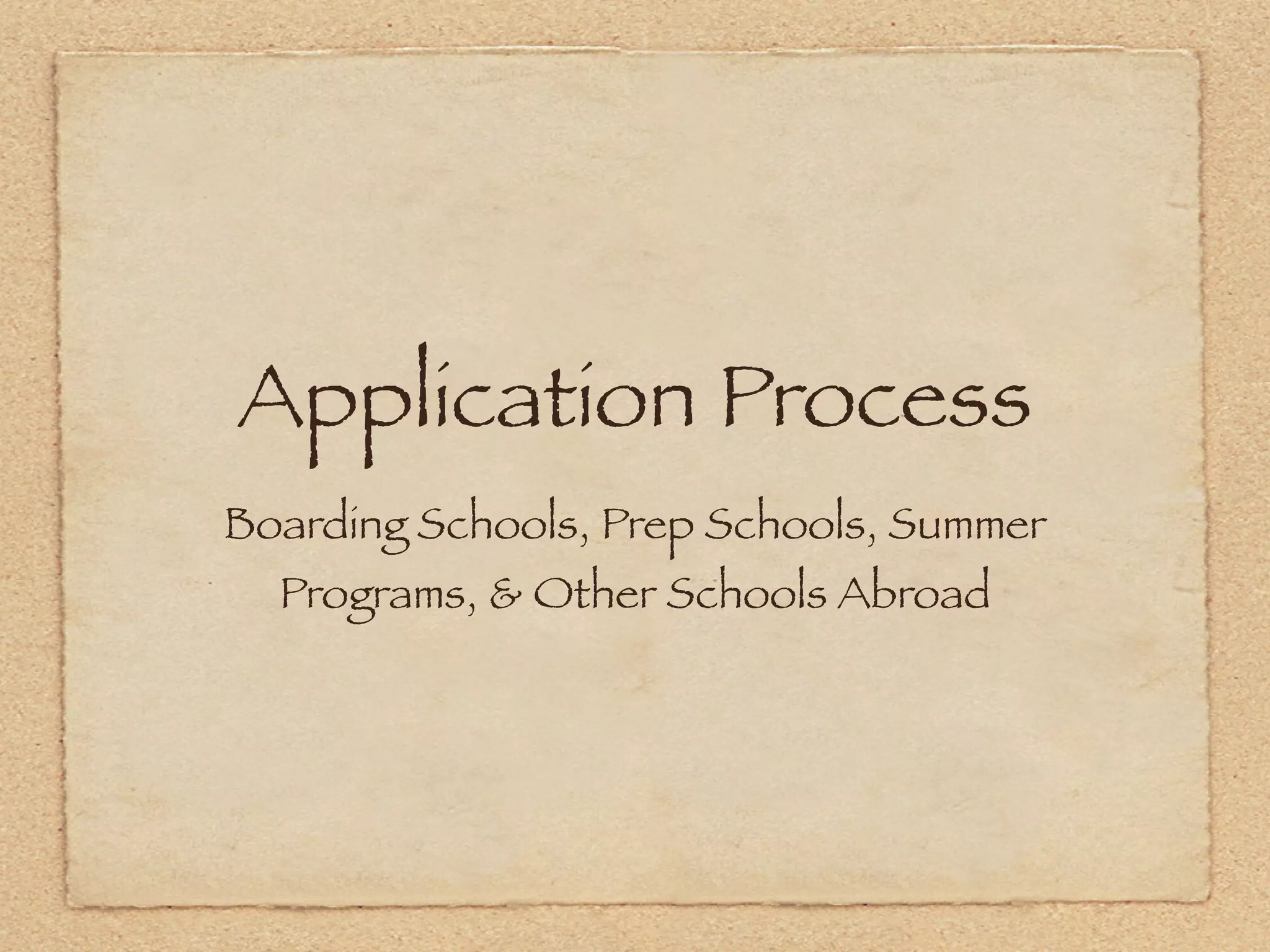The document provides guidance on applying to boarding schools, summer programs, and other schools abroad. It outlines the application process and checklist of required materials, including researching appropriate schools, planning ahead to avoid last minute stress, getting teacher recommendations, transcripts, test scores, and meeting deadlines. Students are advised to visit their counselor to ensure they have all the necessary application requirements organized.