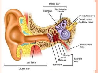 This document discusses otitis media, or middle ear infection. It begins by defining key terms related to ear diseases and infections. It then discusses the incidence, causes, risk factors, signs and symptoms, complications, diagnostic evaluation, and management of otitis media. Otitis media is most common in young children and is usually caused by bacterial or viral infections that obstruct the Eustachian tubes. Common symptoms include ear pain, fever, and hearing loss. Treatment involves antibiotics, anti-inflammatory drugs, or sometimes surgical drainage of fluid from the middle ear. Repeated infections can lead to permanent hearing loss or other complications if left untreated.