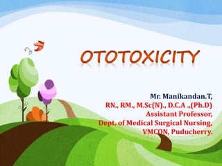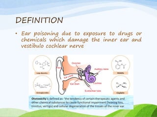 This document defines ototoxicity as ear poisoning caused by exposure to drugs or chemicals that damage the inner ear and vestibulocochlear nerve. It lists various drugs and chemicals that can cause ototoxicity, including quinine, salicylates, aminoglycosides, loop diuretics, antiepileptics, and betablockers. Signs of ototoxicity include tinnitus, imbalance, vertigo, and hearing loss. Diagnosis involves a health history, physical exam, electrocochleography, and electronystagmography. Management focuses on limiting ototoxic drugs, periodic exams, hearing aids, vestibular exercises, and treating underlying causes.